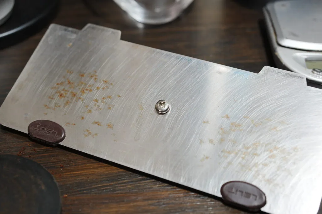 そもそもBiancaの構造として、タンクそのものは樹脂製でできていて、その樹脂タンクを金属のケースに上から差し込み、さらにその上に上記写真のフタを乗せる形になっています。
