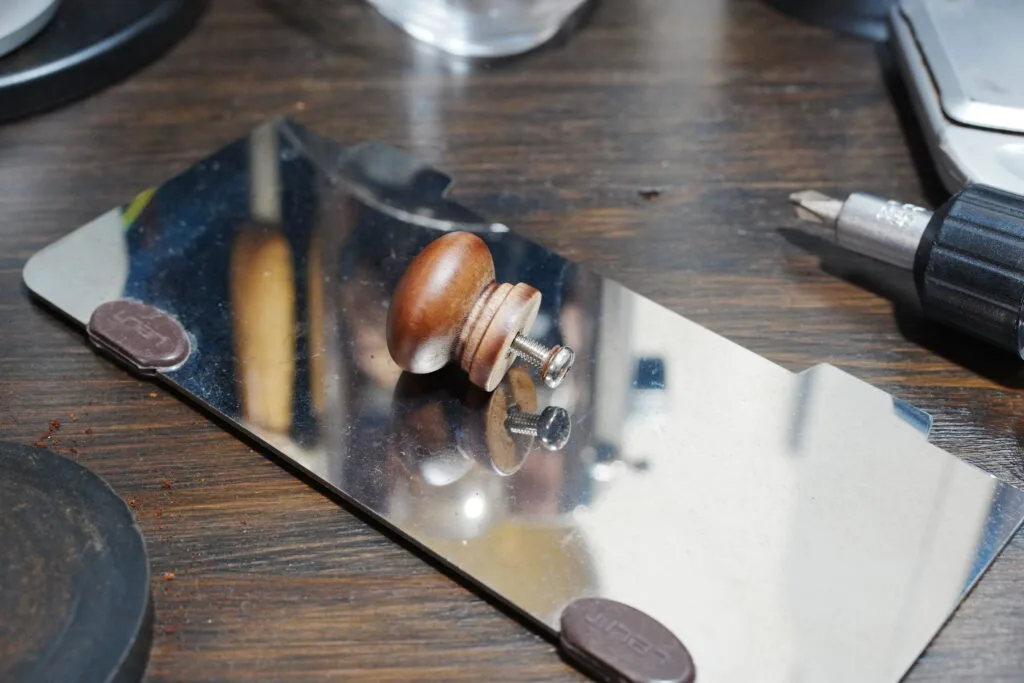 写真は一旦仮組みの状態ですが、このネジを外してウラから穴に通し、取っ手を締め付けます。
